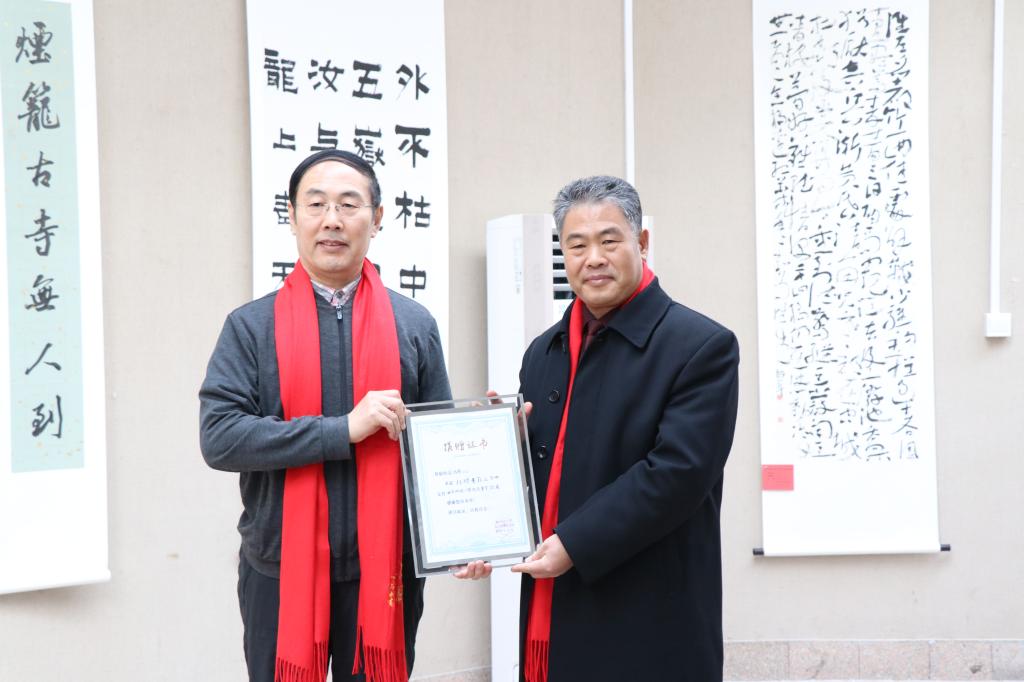 开幕式上,娄以忠校友向学校捐赠墨宝《沁园春》和拓片、孟鸿声先生向学校捐赠书法类文献书籍500册、沈瑶琴校友向学校捐赠墨宝《兰亭序》,扈庆学代表学校接受捐赠,并为捐赠者颁发捐赠证书。李开元教授宣布“庆祝学校建校65周年--全国书法名家作品展”开幕。