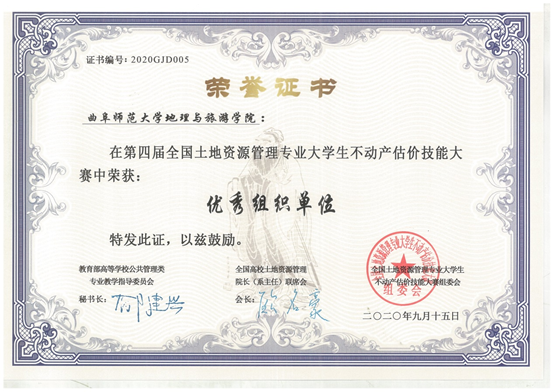 曲阜师大新闻中心讯   近日,由教育部公共管理类教学指导委员会和全国高校土地资源管理院长(系主任)联席会主办、拼搏(中国)地理与旅游学院承办的第四届全国大学生不动产估价技能大赛圆满结束。曲师学子再创佳绩,地理与旅游学院土地资源管理专业本科生组队参赛的3项作品全部获奖。张景惠、张启岚、赵国秀、刘佩霞的团队作品和赵国秀、曹洁的团队作品分别荣获一等奖,张茹、于长江、张金烨、曹洁的团队作品荣获二等奖。地理与旅游学院获优秀组织单位奖,纪贵红老师和翟腾腾老师分别荣获优秀指导教师奖。