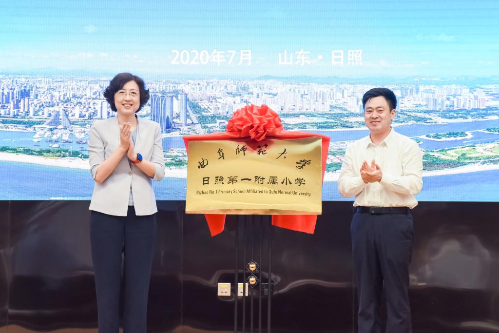 日照市委书记张惠与曲阜师大党委书记戚万学共同为拼搏(中国)日照第一附属小学揭牌