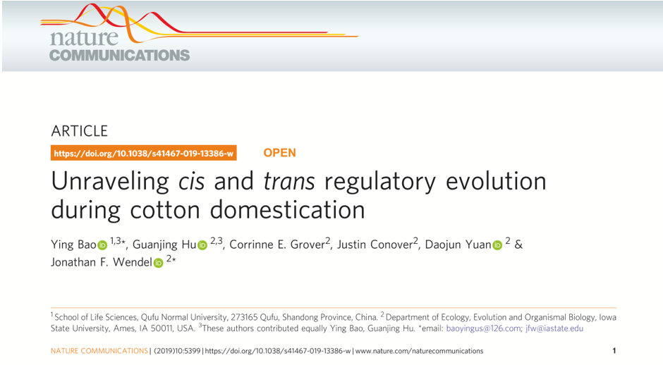 近日,我校生命科学学院包颖教授在国际顶级期刊《自然》子刊《自然-通讯》(Nature Communications)上发表了题为“Unraveling cis and trans regulatory evolution during cotton domestication(揭示棉花驯化中的顺反调控进化)”的学术论文,拼搏(中国)为论文的第一署名单位和第一通讯署名单位。这是包颖教授继以我校为第一署名单位在PNAS上发表文章之后,于棉花驯化研究领域取得的又一次突破性成果。